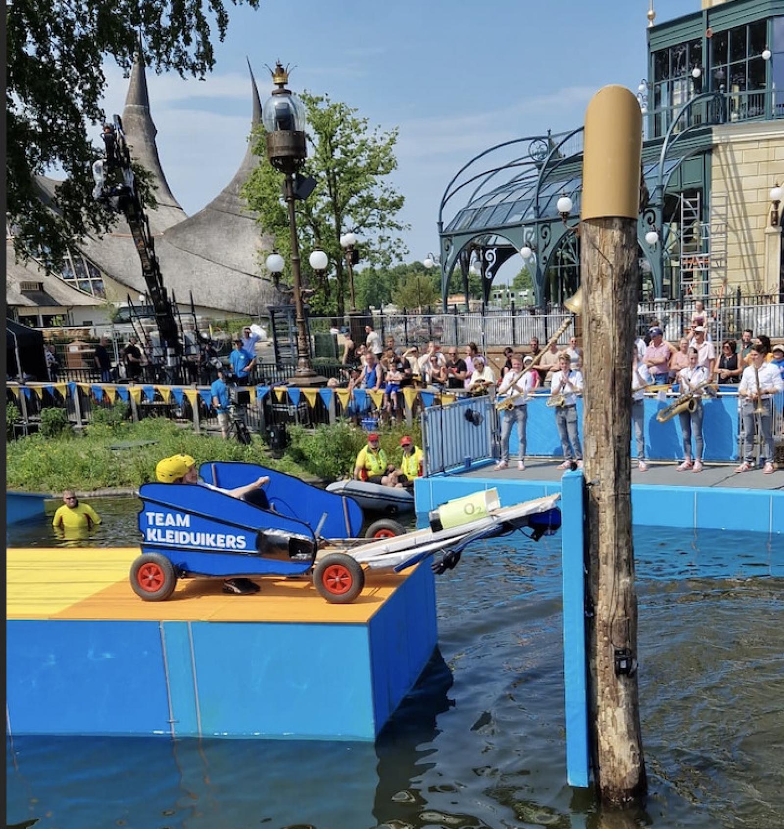 In september 2024 besloten we spontaan een aanmeldvideo op te nemen met de gedachte dat wij toch niet door de selectie zouden komen. Een paar maanden later kregen we mail... we moesten binnen twee weken een complete technische tekening aanleveren. Dus meteen het bouwteam bij elkaar geroepen en een spoedvergadering ingelast. Een heel plan werd besproken en de eerste schetsen werden al gemaakt. Een paar vrije avondjes verder en de tekeningen waren helemaal af. Toen een paar weken later kregen we telefoon. De redactie. Ze waren heel erg enthousiast over onze kar en wilde van alles weten over onze duikvereniging. Ook kregen de kans om ons verhaal bij de kar toe te lichten. Weer een paar weken laten kregen we ineens een mail: "Gefeliciteed Waaghalzen! Jullie zijn geselecteerd om mee te doen aan Te land, ter zee en in de lucht." En toen was het dus officieel. We konden gaan bouwen aan onze kar en natuurlijk ons publiek uitnodigen. Ons bouwteam was verdeeld in 2 kanten. Team constructie en team creatief. De ene helft boog zich over het bouwen van een stevige constructie terwijl de andere weekenden lang bezig waren met papier-mâché en verf. De bouwavonden waren altijd één groot feest! We hadden dit hele avontuur voor geen goud willen missen!