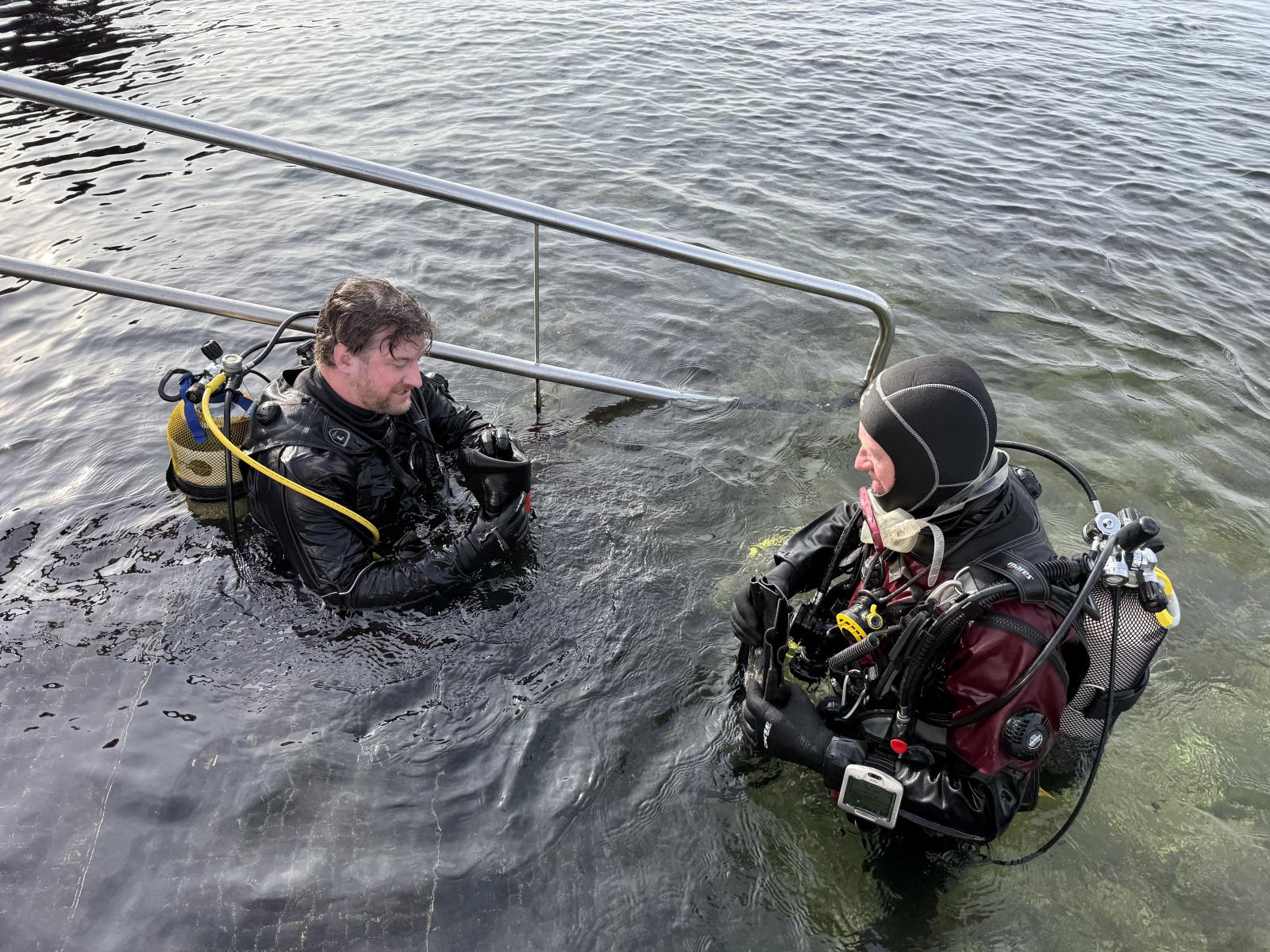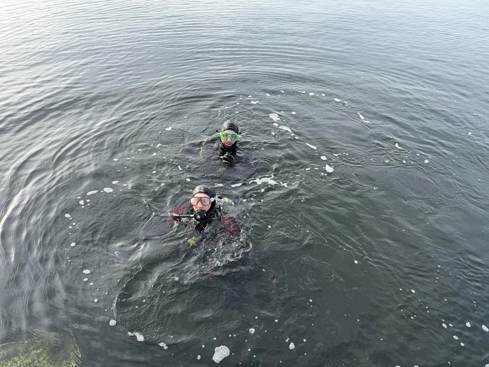 Maar goed, nu dus heerlijk rustig daar. Aiste werd overgehaald haar overpak uit te lenen, tsja, dat werd natuurlijk hijsen door 2 mededuikers om de rits dicht te krijgen.