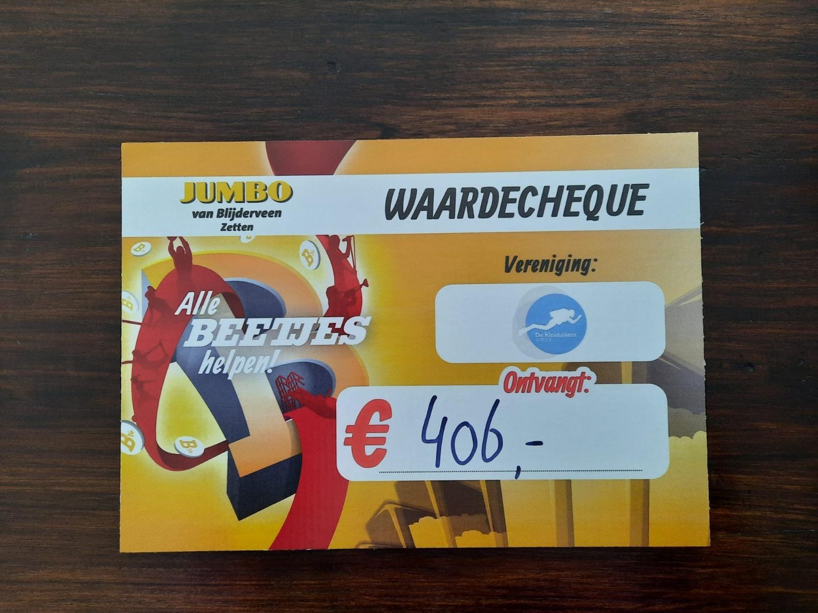Op zaterdag 1 november stopte de actie en op zaterdag 8 november was de uitreiking van de cheques. Het totaal aantal muntjes was bekend, maar hoeveel geld dat betekende was nog totaal onbekend. Uiteindelijk hebben we een mooi bedrag van €406 bij elkaar weten te verzamelen. Wij zijn aangenaam verrast met dit prachtige resultaat. Met deze opbrengst willen wij nieuwe materialen aanschaffen voor het snorkelen met de jeugd.